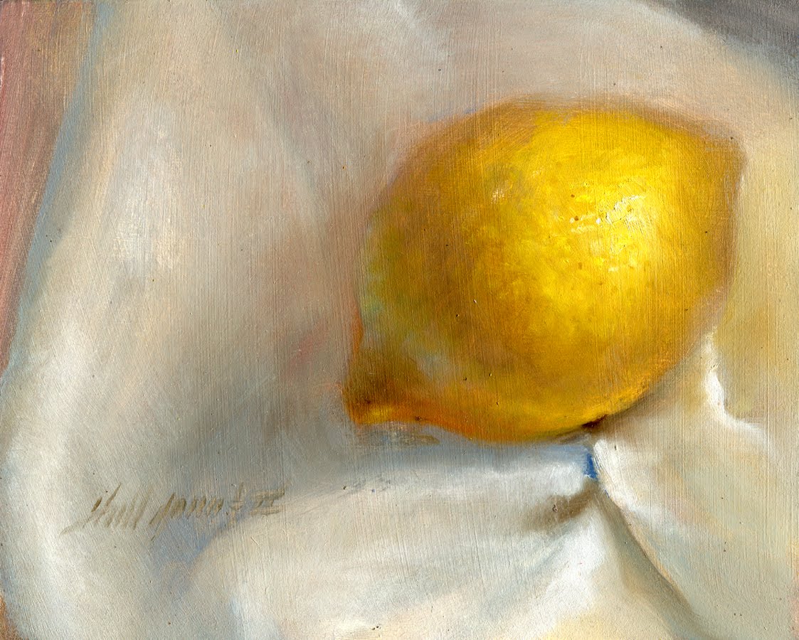 Lemon on White Silky Cloth 8"x10" Original Oil on panel Hall Groat II
